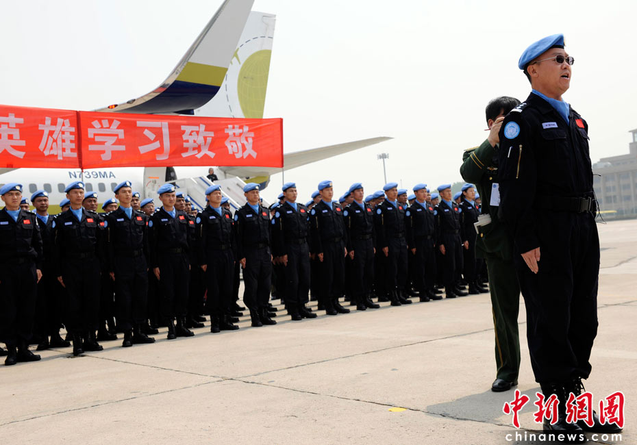 5月4日,中國第八支赴海地維和警察防暴隊全體隊員乘坐聯合國包機返回祖國。公安部副部長孟宏偉、政治部主任蔡安季前往機場迎接。 中新社發 劉震 攝
