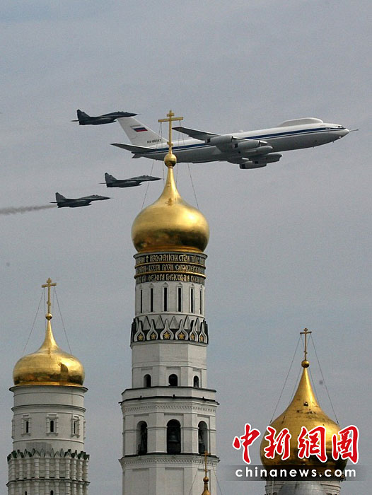 當(dāng)?shù)貢r間5月4日,在俄羅斯首都莫斯科,參加彩排的戰(zhàn)機(jī)編隊(duì)飛過紅場上空。俄羅斯將于5月9日隆重紀(jì)念衛(wèi)國戰(zhàn)爭勝利65周年。圖片來源:中國新聞網(wǎng)