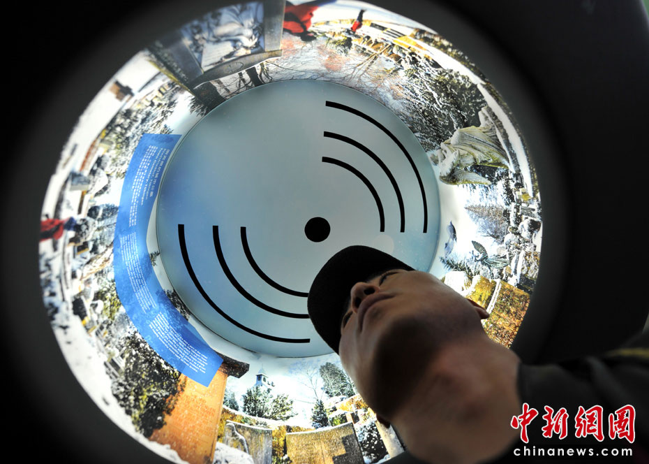 360度環(huán)繞視聽體驗,像個燈罩一樣,游客可以把頭伸進去,聲音效果的確不錯。中新網(wǎng)記者 王紅綱 攝