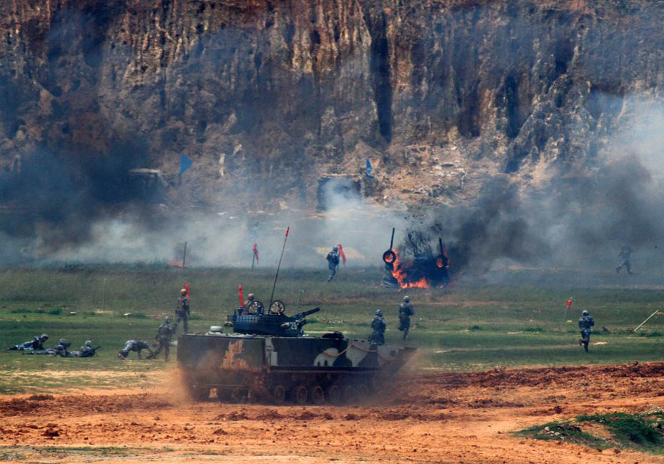 陸戰隊在訓練場進行登陸作戰實兵實彈演練。圖片來源:新華網 查春明攝