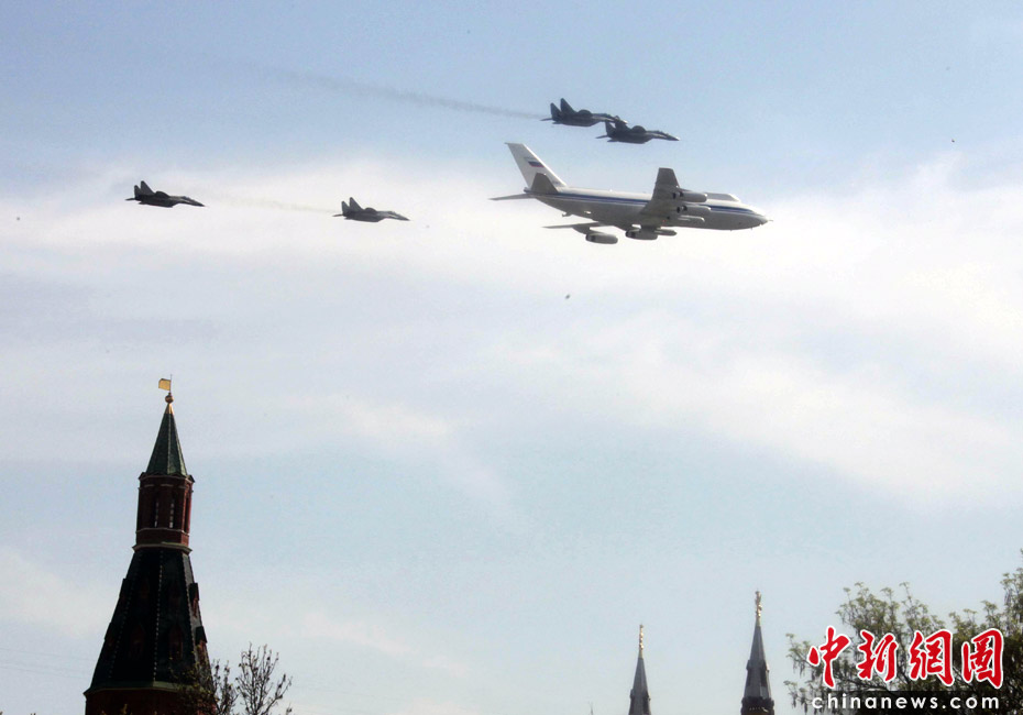5月9日,俄羅斯在莫斯科紅場舉行盛大的閱兵式,慶祝衛國戰爭勝利65周年。莫斯科時間5月9日上午10點(北京時間9日下午2點)許,閱兵式正式開始。圖為空中梯隊飛越紅場上空。中新網記者 張朔 攝