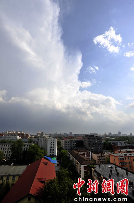 5月18日16時(shí)許,伴隨陣陣?yán)茁暰┏峭唤荡笥辏涤赀^(guò)后東部天空依然籠罩著烏云,而西邊卻已放晴。中新網(wǎng)記者 金碩 攝