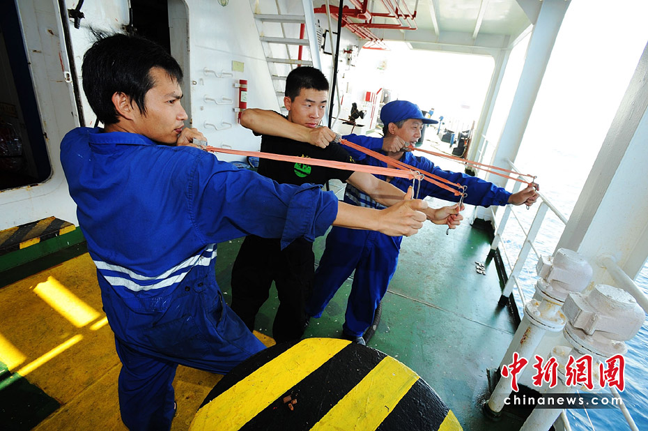 特戰隊員杜磊(中)給船員傳授自制皮彈弓的使用技巧。該船自制皮彈弓20把,并用螺絲、彈珠和自制短鋼筋作子彈,作為防御海盜的土武器之一。江山 攝