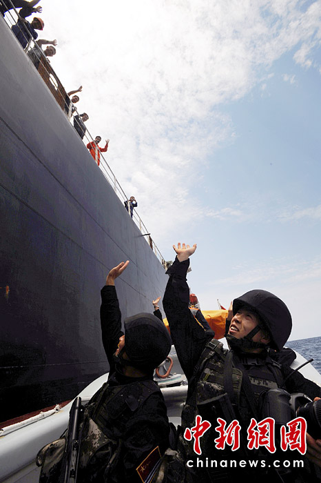4月16日當地時間11時,第五批護航編隊圓滿完成第188批護航任務,在“嘉永山”輪船實施隨船護衛的4名特戰隊員換乘小艇離開時,船員紛紛來到甲板與他們揮手告別。江山 攝