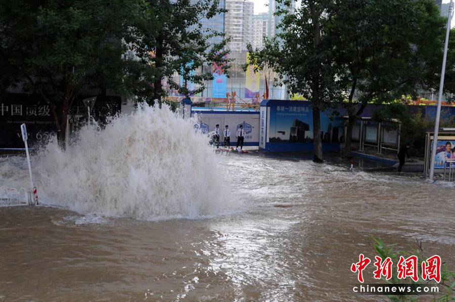 2010年5月25日下午4點半左右,北京京廣橋附近發生水管爆裂,水柱噴射到兩層樓高,流出的水已成河,造成東三環嚴重擁堵。牛宏超 攝(圖片來源:CFP)