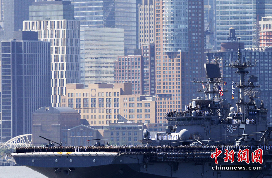 當(dāng)?shù)貢r(shí)間5月26日,美國(guó)第23屆紐約艦隊(duì)周開(kāi)幕,包括“硫磺島”號(hào)兩棲攻擊艦在內(nèi)的11艘參加艦隊(duì)周活動(dòng)的軍艦由南向北在哈得孫河面上游弋。紐約民眾將以停靠在曼哈頓哈得孫河86號(hào)碼頭的“無(wú)畏號(hào)”航母博物館為中心,展開(kāi)為期一周的慶祝和紀(jì)念活動(dòng)。圖片來(lái)源:中國(guó)新聞網(wǎng)