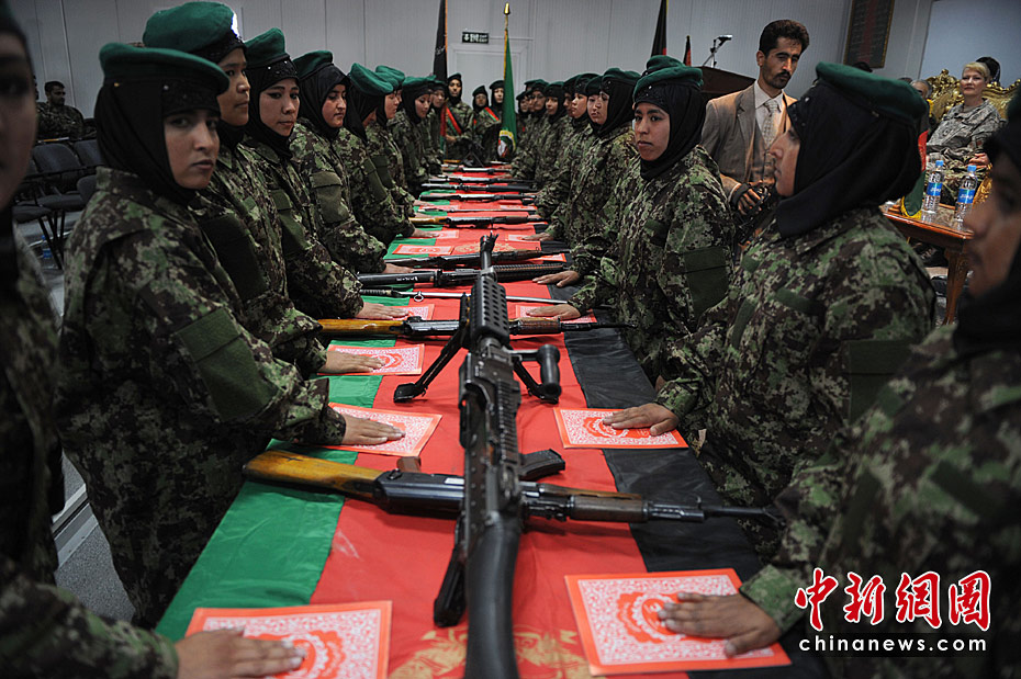 當(dāng)?shù)貢r(shí)間5月27日,阿富汗首批女軍官在首都喀布爾舉行畢業(yè)宣誓儀式。這是阿富汗軍隊(duì)征召女兵計(jì)劃的一部分,按照計(jì)劃她們將根據(jù)各自受教育程度被賦予不同的職位:接受過12年以上教育的女兵將擔(dān)任文職官;接受過9年到11年教育的將擔(dān)任軍士長(zhǎng);受教育程度更低的女兵則只能當(dāng)列兵。圖片來(lái)源:中國(guó)新聞網(wǎng)