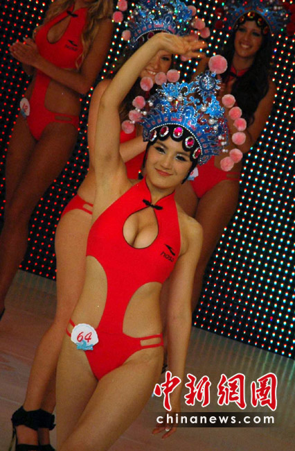 5月29日晚,第35屆國際比基尼小姐全球總決賽在三亞“美麗之冠”落下帷幕,22歲的羅馬尼亞選手Diana Irina Boanca摘得冠軍。總決賽還評選出了四季小姐,18歲的中國選手趙茜獲得“秋季小姐”,澳大利亞、委內瑞拉和拉脫維亞選手分別獲得春、夏、冬季小姐。共有來自世界各地的64位佳麗參加了總決賽的角逐。當晚,佳麗們展示了各自國家或地區特色的民族服飾,用不同的方式展示了不同風格的比基尼“秀”,性感迷人。 中新社記者 尹海明攝