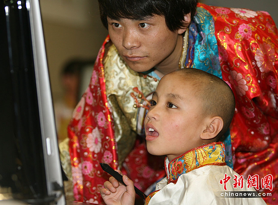 5月31日,玉樹地震孤兒多杰仁青在老師的指導(dǎo)下在北京國家圖書館體驗(yàn)新開通的少兒數(shù)字圖書館,迎接六一兒童節(jié)。這批玉樹孤兒共23名,于5月23日抵京,由“中華少年兒童慈善救助基金會”安置。在北京度過“六一”后,他們還將休整3個(gè)月,待災(zāi)區(qū)情況穩(wěn)定后,中華兒慈會將與當(dāng)?shù)氐拿裾块T協(xié)商,在征求孤兒本人意愿的基礎(chǔ)上,或讓他們返回原地上學(xué),或者在內(nèi)地長期居住。基金會將一直支持他們到18歲成人。中新社發(fā) 蘇丹 攝