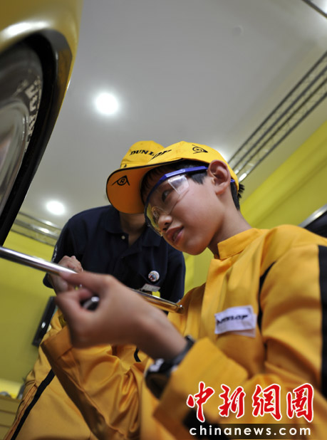 圖為孩子在體驗(yàn)賽車(chē)場(chǎng)上的技師。 中新網(wǎng)記者 王紅綱 攝