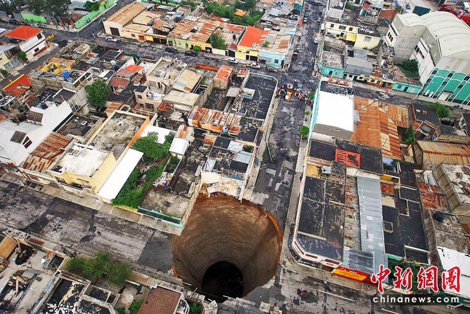 5月31日,受颶風“阿加莎”的影響,危地馬拉首都危地馬拉城出現(xiàn)一個深達60米塌陷洞,有目擊稱一幢3層建筑墜入洞中,至少造成1人死亡。圖片來源:中國新聞網