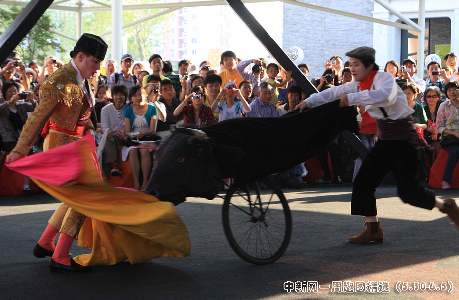 新近,上海世博園區(qū)里的各種趣味演出連連,西班牙斗牛士與一頭假公牛相互角逐,讓眾多游客樂開懷。圖片來源:中國(guó)新聞網(wǎng)>>點(diǎn)擊觀看詳細(xì)內(nèi)容