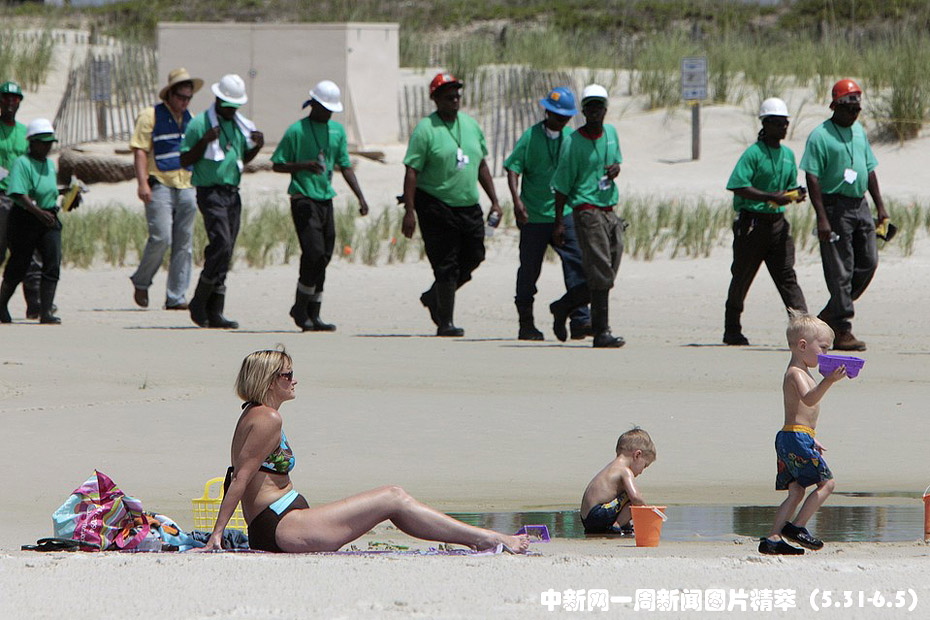 周二(1日),美國阿拉巴馬州海岸,人們在海邊曬太陽,石油工人在后面走過。墨西哥灣漏油事件已經開始影響到該地區的旅游。