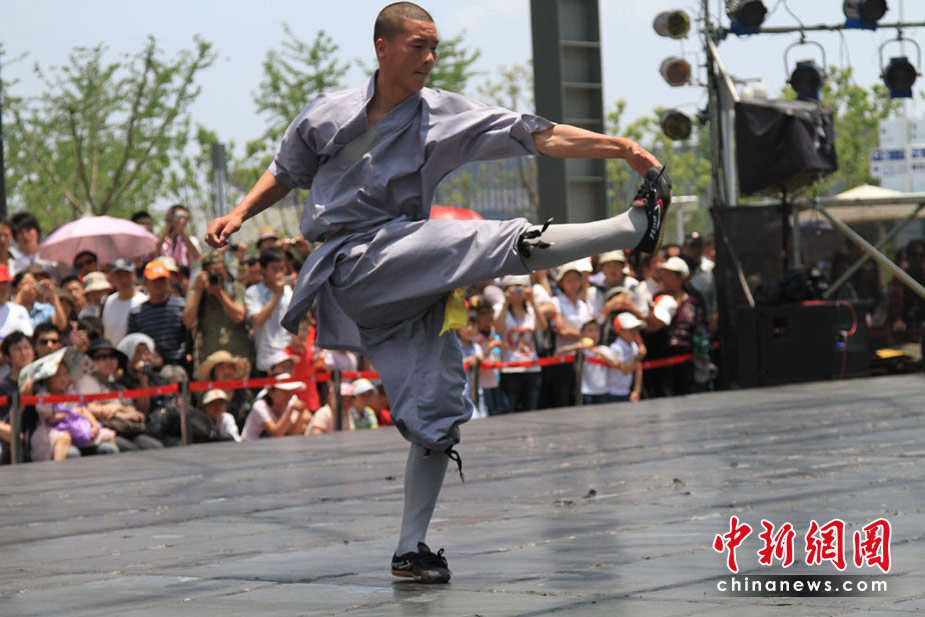 自5月1日開(kāi)始,上海世博園D片區(qū)綜藝廣場(chǎng)每天都有少林寺功夫展演,受到世博參觀者的熱捧。中新社記者 殷春永攝