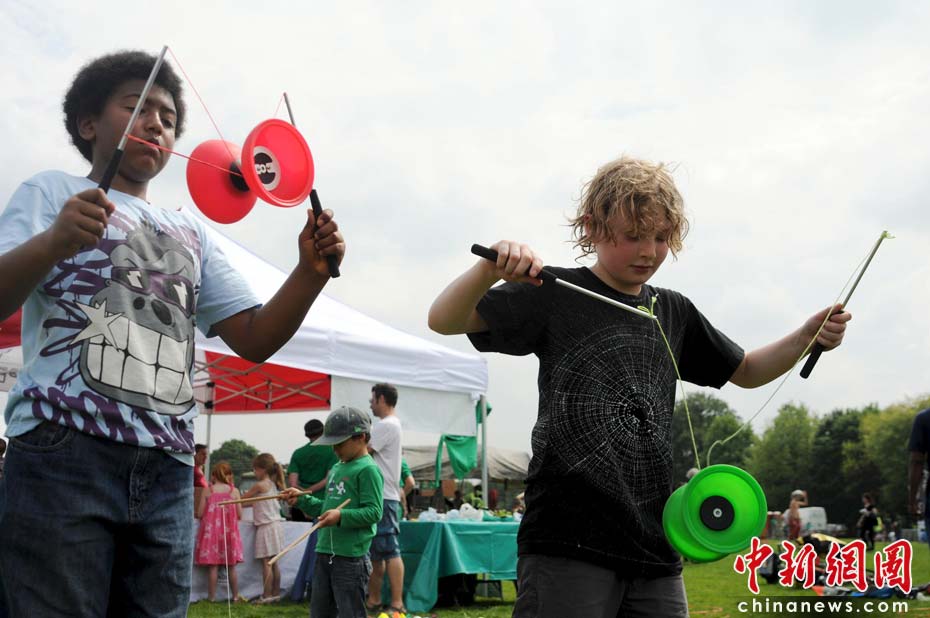 當地時間2010年6月6日,英國倫敦舉行卡姆登綠色市集(Camden Green Fair),這是英國倫敦每年環保領域的“重頭戲”。本屆市集的主旨是要喚起大眾對環境問題的關注,選擇更加可持續發展的生活方式。據活動主辦方預計,本屆市集將吸引來自英國各地和世界各國的2萬多人參加。圖為抖空竹是個時髦運動。Fiona/攝 Fiona 馬小剛/文