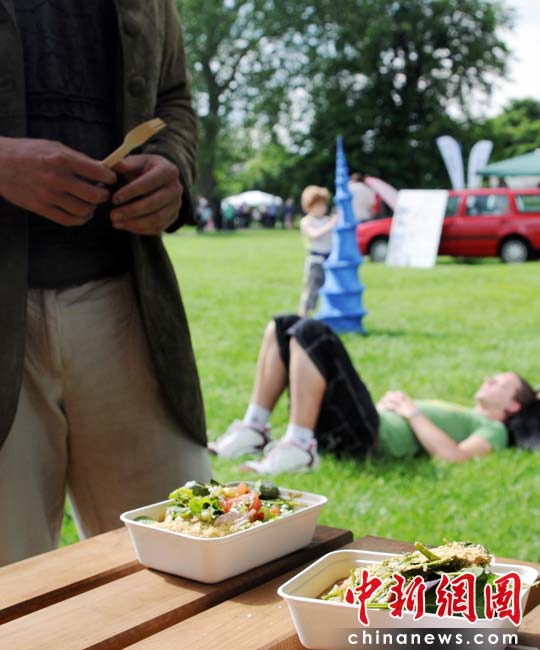 當地時間2010年6月6日,英國倫敦舉行卡姆登綠色市集(Camden Green Fair),這是英國倫敦每年環保領域的“重頭戲”。本屆市集的主旨是要喚起大眾對環境問題的關注,選擇更加可持續發展的生活方式。據活動主辦方預計,本屆市集將吸引來自英國各地和世界各國的2萬多人參加。圖為各種素食是綠色展會的絕對“主力”。Fiona/攝 Fiona 馬小剛/文