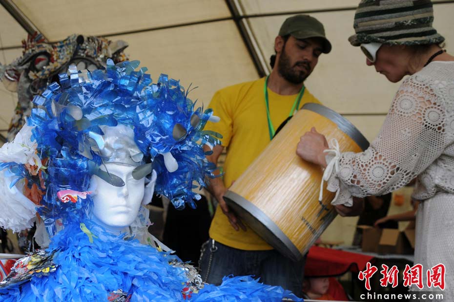 當地時間2010年6月6日,英國倫敦舉行卡姆登綠色市集(Camden Green Fair),這是英國倫敦每年環保領域的“重頭戲”。本屆市集的主旨是要喚起大眾對環境問題的關注,選擇更加可持續發展的生活方式。據活動主辦方預計,本屆市集將吸引來自英國各地和世界各國的2萬多人參加。圖為藝術家們用回收的塑料制品制作的時尚作品。仔細看還能找到“品客薯片”包裝的細微痕跡。Fiona/攝 Fiona 馬小剛/文