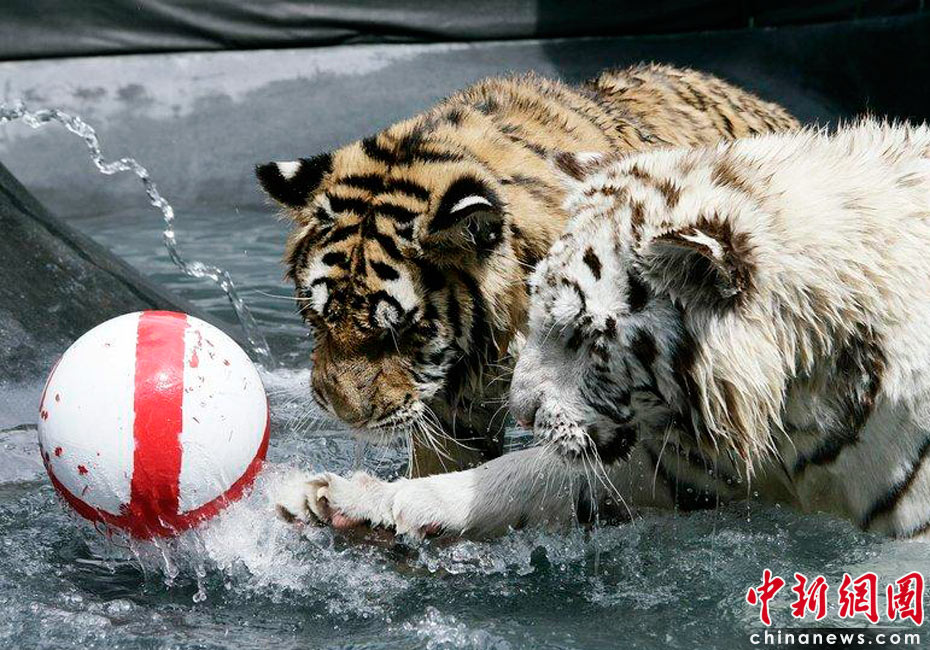 2010年6月7日,美國南卡羅來納州美特爾海灘,在世界杯即將開幕之際,一歲的小白虎Sundaram和孟加拉虎Mukti率先在水里上演了一出足球大戲。英格蘭隊首戰將對陣美國隊,因此足球外側也被印上了英格蘭旗的標志。cfp