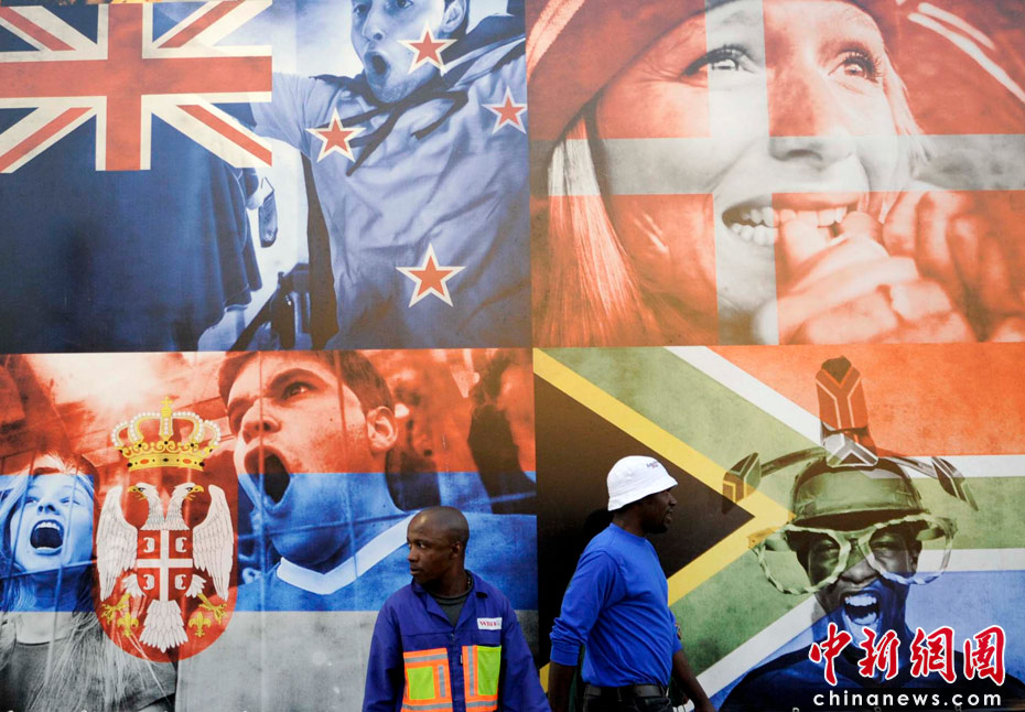 當(dāng)?shù)貢r(shí)間6月9日,民眾在南非約翰內(nèi)斯堡街頭的世界杯宣傳畫前,非洲大陸即將首次迎來足球世界杯。中新社發(fā) 廖攀 攝