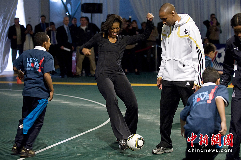 圖為2010年3月5日,美國第一夫人米歇爾·奧巴馬在華盛頓參加了由美國足球基金會組織的一項慈善活動,米歇爾在活動現(xiàn)場與小朋友們一起享受快樂足球。該活動旨在抵制兒童肥胖,鼓勵孩子們選擇更加健康積極的生活方式。