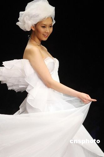 11月7日,“名瑞杯”2008中國婚紗設計大賽在北京中國國際時裝周上舉行,共有來自中國14個地區的25份稿件入圍了最后的決賽。參賽作品類型設計多樣化,有顏色和造型都很獨特的禮服,也有哥特式風格的新娘裝等,作品設計大膽新穎,使用夸張的造型,同時運用以點堆積成面的裝飾手法,在裙身上做出圖案或者肌理,來豐富服裝的整體內容。現在的婚紗已經不是婚禮的附屬品,而是慢慢的成為時尚亮點,新娘通過選擇婚紗來體現自己的個性和心情,婚紗成為一種特殊的媒介。圖為模特展示婚紗設計大賽作品。中新社發 錢興強 攝