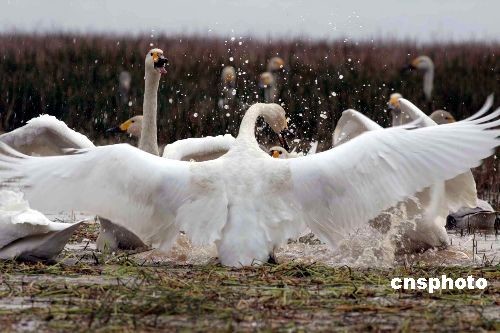 2008年11月15日,數千只大天鵝陸續飛抵江西九江縣東湖棲息覓食。由于鄱陽湖水位上漲,以及當地環境適宜等原因,大量國家二級保護動物天鵝前來越冬。中新社發 張 俊 攝