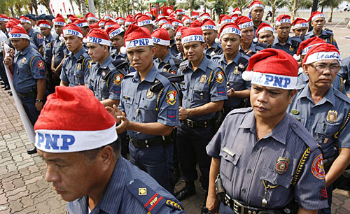 12月2日,在菲律賓馬尼拉,菲律賓警察頭戴圣誕老人的帽子參加“圣誕老人警察2008”活動啟動儀式。
