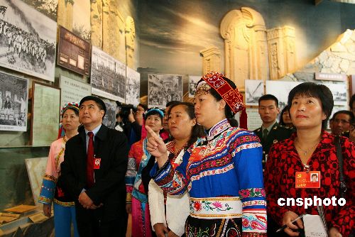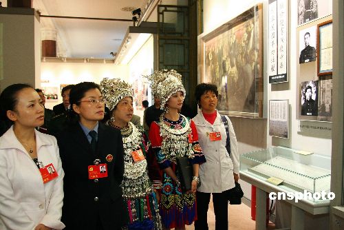 10月19日,參加中共十七大會議的湖南省代表身著傳統苗族服飾,在軍事博物館參觀《復興之路》展覽。中新社發 富田 攝