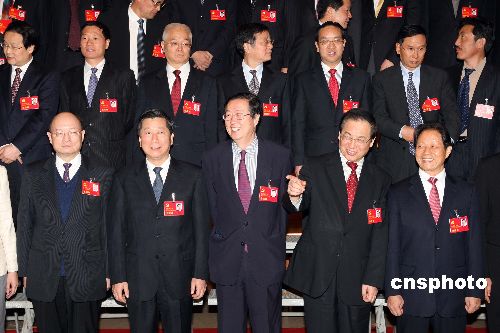 十月十九日,出席中共十七大的中央金融系統代表在駐地合影留念。前排從左至右為國家開發銀行行長陳元、證監會主席尚福林、中國人民銀行行長周小川、銀監會主席劉明康、保監會主席吳定富。中新社發 毛建軍 攝