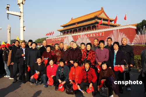 10月21日,中國共產(chǎn)黨第十七次全國代表大會在北京人民大會堂閉幕,在天安門廣場上關(guān)注大會盛況的游人爭相拍照留念。中新社發(fā) 鄭雄增 攝
