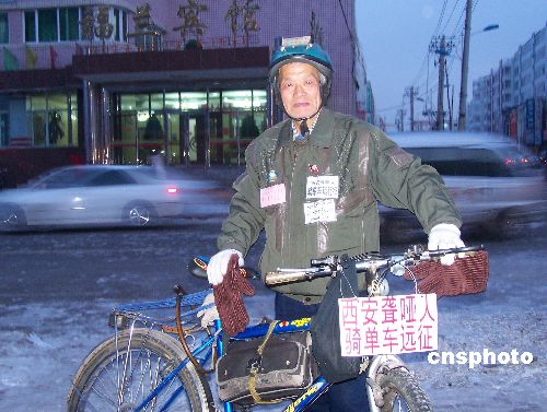 11月28日,來自陜西西安的一位頭發花白、精神矍鑠的聾啞老人唐應成騎著單車抵達黑河市福蘭賓館附近。為了完成自己“走遍全中國,宣傳2008年北京奧運會,成為全國聾啞第一人”的夢想,從1997年4月5日開始,在家人的全力支持下,62歲的西安聾啞老人唐應成騎單車,先后沿四川、云南、湖北、湖南、廣東、海南、廣西、新疆、山西、內蒙古一路走了下來,經過長達十年零三個月的艱苦跋涉,已經走過了全國27個省、市、自治區,行程42萬多公里,以自己獨特的方式,表達了一個普通公民對北京2008年奧運會的支持。經過與老人用紙和筆的采訪和溝通,老人從隨行的包裹中拿出許多各地對他的相關報道。唐應成每到一地,除了收集當地群眾關于申辦奧運的祝福語、宣傳畫外,還用隨身攜帶的照相機,拍下所到之處的風土人情和自然風光,匯集成簡單的畫冊,作為遠征的見證。