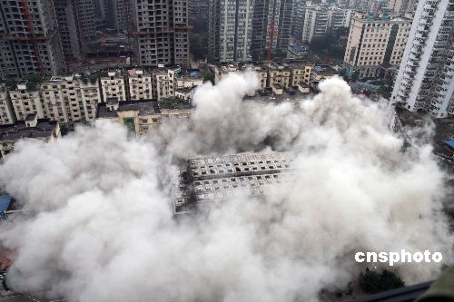 12月6日15時,隨著一聲爆破聲起,位于重慶市主城鬧市的一棟25層、78米高的爛尾樓轟然倒下。該樓是中國西南地區到目前為止爆破拆除的最高大樓,也是重慶用爆破方式拆除的最大一座爛尾樓。中新社發 郭晉嘉 攝