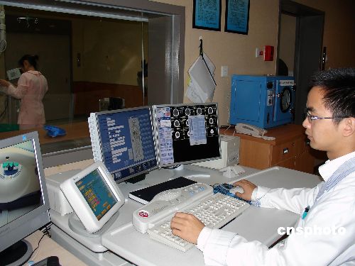 圖為十四日該院醫(yī)技人員正在操作CT設(shè)備。