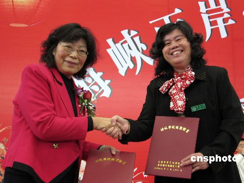 一月二十一日,上海臺商子女學校代理校長劉遼萍(左),與臺北縣秀朗“國小”校長葉瑞芬在上海簽約締結姊妹學校。今后,雙方師生將展開交流和研習活動。據了解,大陸目前有三所專門服務于臺商子女的學校。中新社發 潘索菲 攝