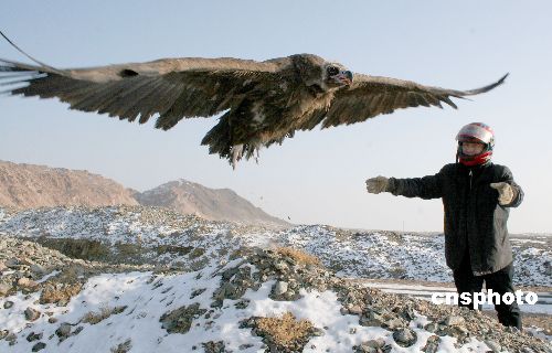 2008年2月2日,新疆哈密地區野生動植物保護辦公室的一名工作人員在放飛禿鷲。07年12月初,新疆哈密的一名民工將一只受重傷國家二級保護動物禿鷲送到新疆哈密地區野生動植物保護辦公室進行救治。2月2日,完全恢復健康的禿鷲被放歸大自然。 據介紹, 禿鷲又名座山雕、狗頭鷲,分布在我國的新疆、青海、甘肅、寧夏、內蒙古等地。它們屬于大型猛禽。全長約110厘米。身體的羽毛主要呈黑褐色。主要以鳥獸的尸體和其他腐爛動物為食。中新社發 普拉提 攝