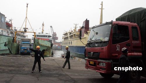 2月4日,海口港碼頭,出島和進(jìn)島運(yùn)輸冬季瓜菜在卡車接連不斷。長江中下游地區(qū)大量大棚蔬菜因雪災(zāi)凍死,位于熱帶的海南島成了名副其實(shí)的“中國菜籃子”。中國商務(wù)部、鐵道部、交通部三部委官員目前已聯(lián)合抵瓊,會(huì)商緊急調(diào)運(yùn)海南冬季瓜菜,以保障雪災(zāi)災(zāi)區(qū)人民及港澳地區(qū)的蔬菜供應(yīng)。中新社發(fā) 關(guān)向東 攝