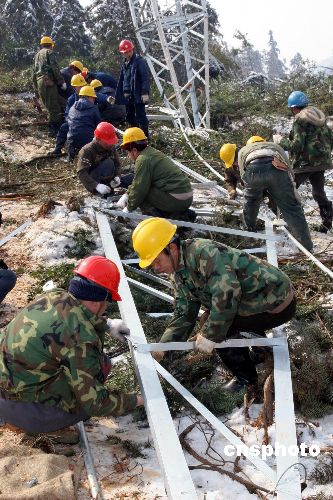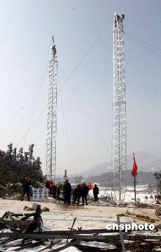 一座塔倒下去,又一座塔立起來,湖南望城縣橋驛鎮月塘村華沙線500千伏塔,電力工人羅海文、羅長明、周景華不幸遇難的送變電倒塌電塔現場,經過湖南省送變電建設有限公司三分公司140多職工和120名武警官兵日夜搶修,2月3日,在原41號鐵塔的廢墟上立起了一座新塔。另外44、43號倒塌的鐵塔也在近日修復。中新社發 殷中民 攝