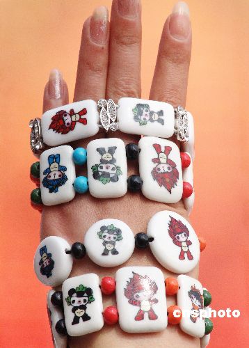在江西省景德鎮營業員展示奧運福娃瓷手鏈。