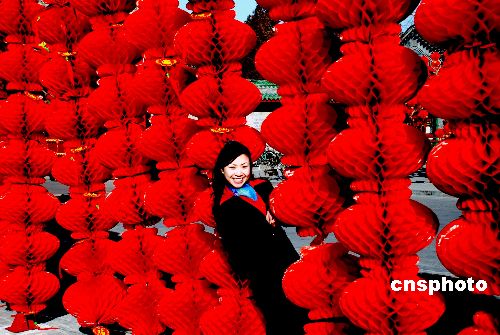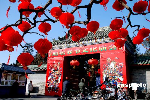 2月5日,北京地壇公園門口裝飾一新、喜氣洋洋。從2月6日到13日,北京地壇將舉辦2008年北京特色傳統(tǒng)廟會。今年的廟會除了傳統(tǒng)的民俗表演項目外,還將川劇、吉尼斯奇人絕技等引進,更加豐富多彩。中新社發(fā) 楊慧峰 攝