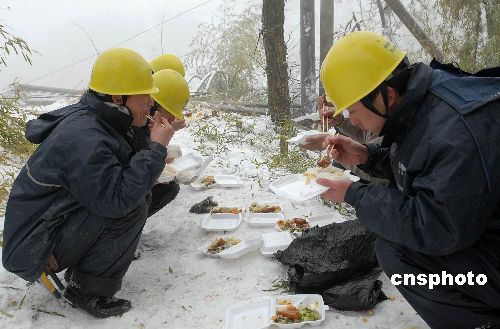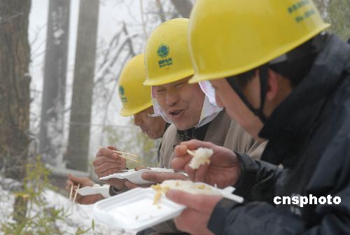 2月6日下午1點,新昌城關供電營業所城區供電服務班班長梁雍和他的隊員們一起在施工現場吃中飯。當日,浙江新昌縣供電局城關供電營業所的員工在該縣城南鄉搶修秦巖177線,目前,新昌有35個行政村因雪災尚未通電,561名電力搶修隊員仍奮戰在搶修一線。據悉,電力工人們為早日通電,年夜飯也只能在山上吃了。中新社發 袁云 攝