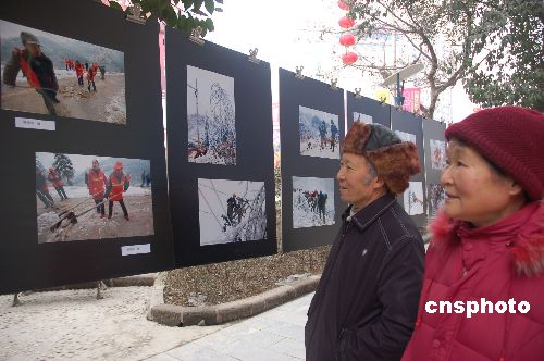 2月7日,貴州黔東南苗族侗族自治州攝影家協(xié)會在凱里市街頭舉行“萬眾一心抗雪凝”攝影圖片展,吸引了市民駐足觀看。中新社發(fā) 吳如雄 攝