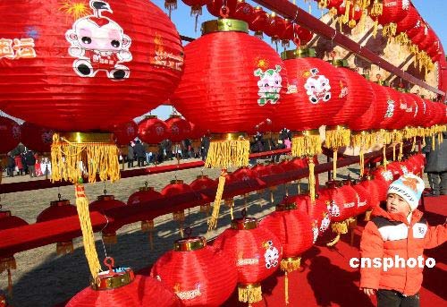 2月21日,是中國傳統的元宵佳節,北京許多公園舉行豐富多采的元宵燈會活動,圖為在北京朝陽區舉辦的元宵燈會上繪有喜迎奧運卡通圖案的紅燈吸引小朋友。中新社發 錢興強 攝
