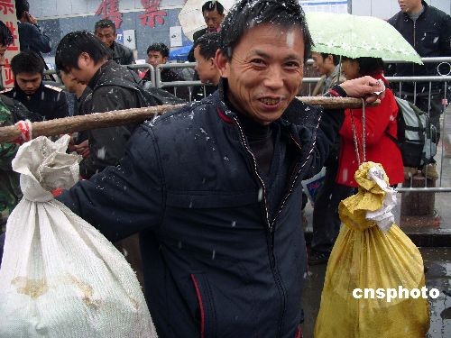 圖:湖北宜昌春雪難擋民工出行