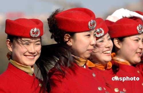 三月三日,北京天安門(mén)廣場(chǎng),女服務(wù)員笑容燦爛迎“兩會(huì)”。當(dāng)日下午,全國(guó)政協(xié)十一屆一次會(huì)議在北京人民大會(huì)堂隆重開(kāi)幕。中新社發(fā) 王東明 攝