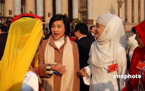3月5日,十一屆全國人大一次會議在北京人民大會堂開幕。香港鳳凰衛視名主播吳小莉(左二),會前在大會堂前采訪少數民族代表。中新社發 劉萬強 攝