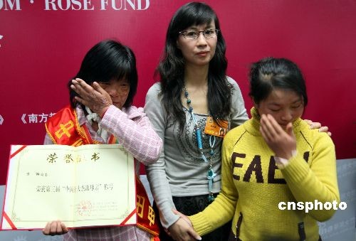 2008中國十大杰出母親熊麗(左)、被硫酸毀容的受助患者韓鳳宇成為第一批受助者。圖中為全國政協(xié)委員張曉梅。