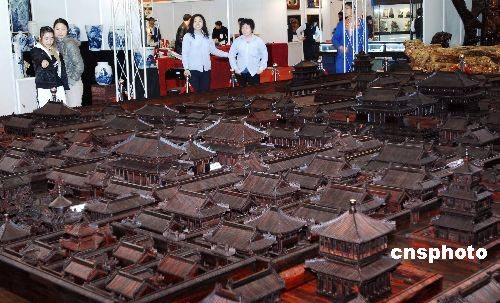 3月20日,為期5天的“第六屆全國工藝品、旅游品、禮品博覽會暨第十一屆春季(大連)中國古玩藝術品博覽會”在大連星海會展中心舉行。在展會西廳區,一個一展現古都風貌喜迎2008年奧運會為創作宗旨的按正式比例縮小120倍的紫檀巨雕故宮全景,吸引了眾多市民的眼球。這個作品9米長,寬7米,總面積60余平方米,由50余位高級技師歷時6年精心雕制而成。該作品無論從用料、耗時都令人稱絕。如此大型紫檀木雕藝術作品也實屬罕見。中新社發 劉德斌 攝