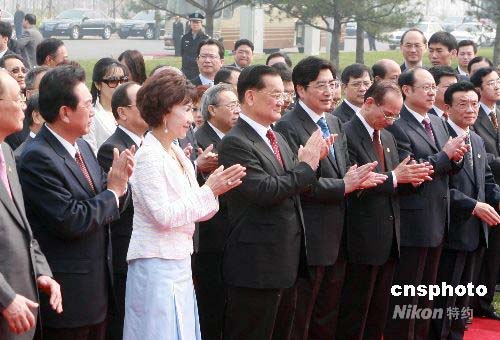 4月29日,中共中央臺灣事務辦公室主任陳云林、中國國民黨榮譽主席連戰、北京市委副書記郭金龍在北京奧林匹克體育中心區出席“水袖”雕塑揭幕儀式。中新社發 廖文靜 攝