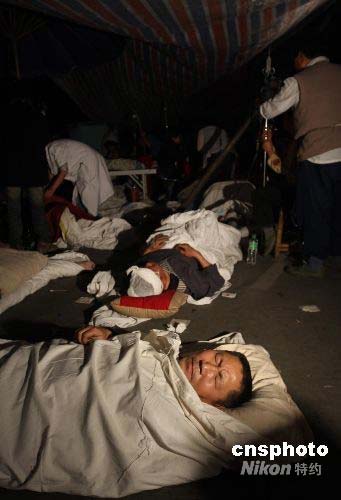 5月12日14時28分,在四川汶川縣(北緯31度,東經103.4度)發生7.8級地震。圖為受傷的災民在街上接受救治。中新社發 黃榮 攝