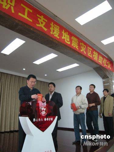 5月12日四川發(fā)生強(qiáng)烈地震后,遼寧民眾情牽災(zāi)區(qū)。從5月14日開(kāi)始,遼寧各企事業(yè)單位干部和職工紛紛踴躍捐款,支援四川抗震救災(zāi)。圖為14日上午,遼寧省民政廳300余名干部和職工熱心捐款。中新社發(fā) 沈殿成 攝